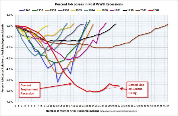 This chart represents the percent of jobs lost since peak employment was reached. The dashed line is supposed to compensate for Bureau of Census "make-work" jobs.Now, let's examine these charts using an electron microscope.